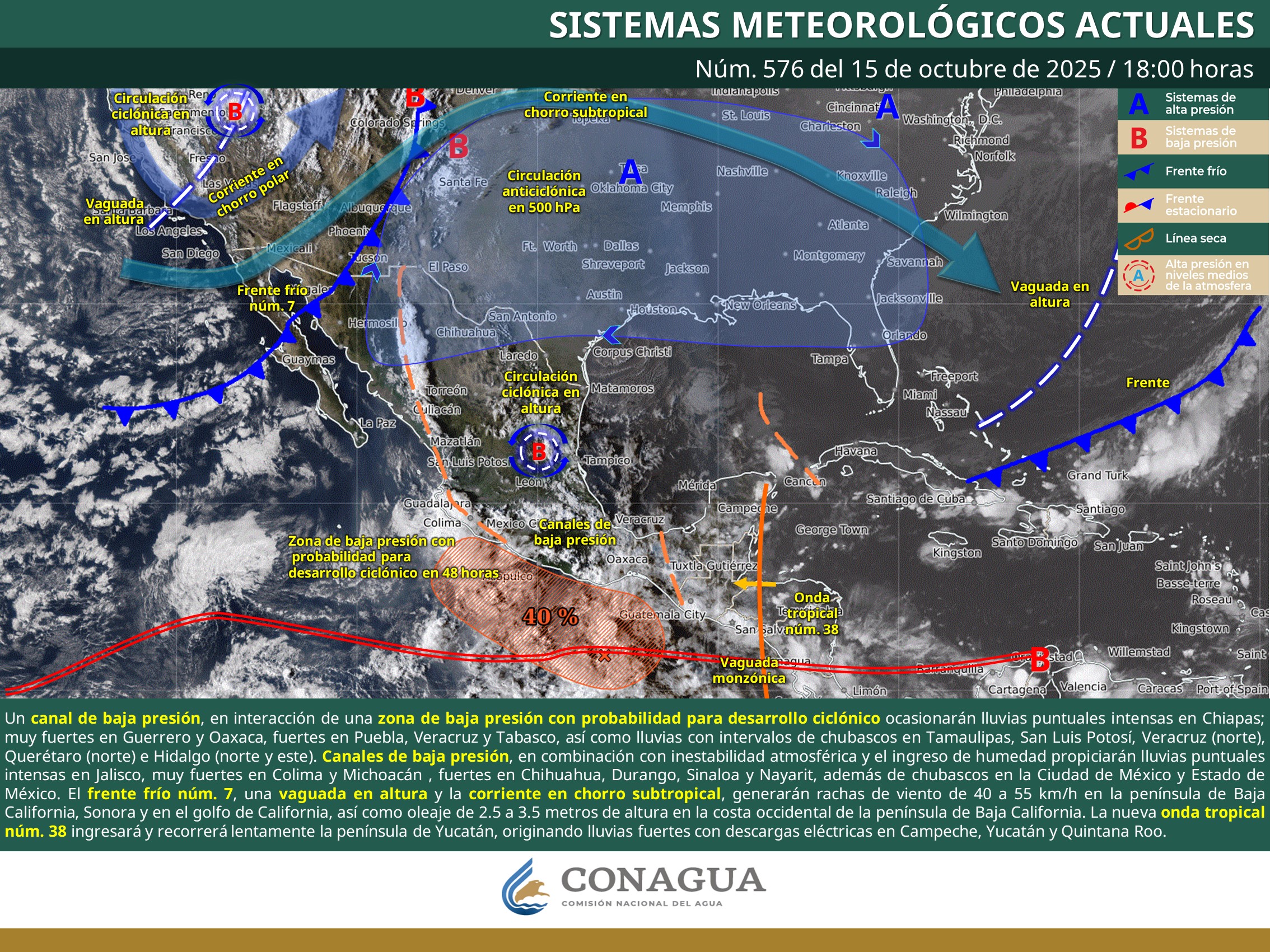 Viento de 30 a 45 km/h con rachas de 60 a 75 km/h: costas de Oaxaca (este) y Chiapas (oeste).